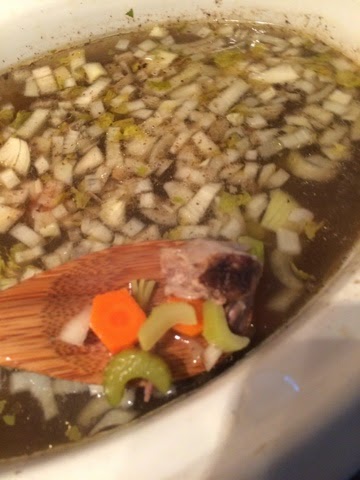 Still finding the last of the locally raised quarter of a steer we had purchased last june. This was two soup shanks, I had browned and then put into the crockpot over night with onion skins, celery ends, carrot tops. Look how dark this stock came out! Then I strained everything, took all the meat off the bones, added lots of onion, chopped celery and carrots. There is a small amount left, for maybe a lunch.