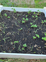 New corn and bush bean bed. After a thorough watering I put a pop up mesh protector over it. Realized mine have hit their last legs (lasted for over 15 years) so I found the same size and ordered 3 of them.Onions and potatoes. One potato pot still hasn't shown any greenery.